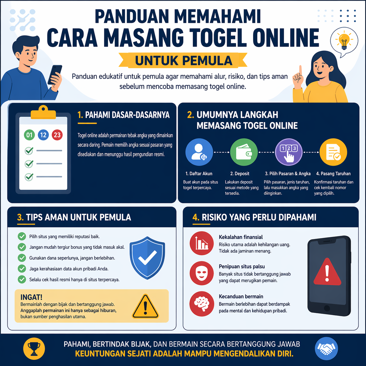 Banyak orang mencari panduan memahami cara masang togel online untuk pemula karena penasaran dengan sistem, istilah, dan alur yang sering muncul di internet. Namun sebelum melangkah lebih jauh, hal yang paling penting justru bukan sekadar memahami tampilannya, melainkan memahami risiko togel online untuk pemula secara utuh. Di balik kemasan platform yang terlihat sederhana, ada banyak hal yang perlu diperhatikan, mulai dari keamanan data pribadi, potensi kerugian finansial, hingga dampak psikologis yang sering tidak disadari pada tahap awal. Inilah mengapa pembahasan edukatif sangat dibutuhkan agar seseorang tidak salah menilai informasi yang beredar dan tidak mudah tergoda oleh janji manis yang belum tentu benar.